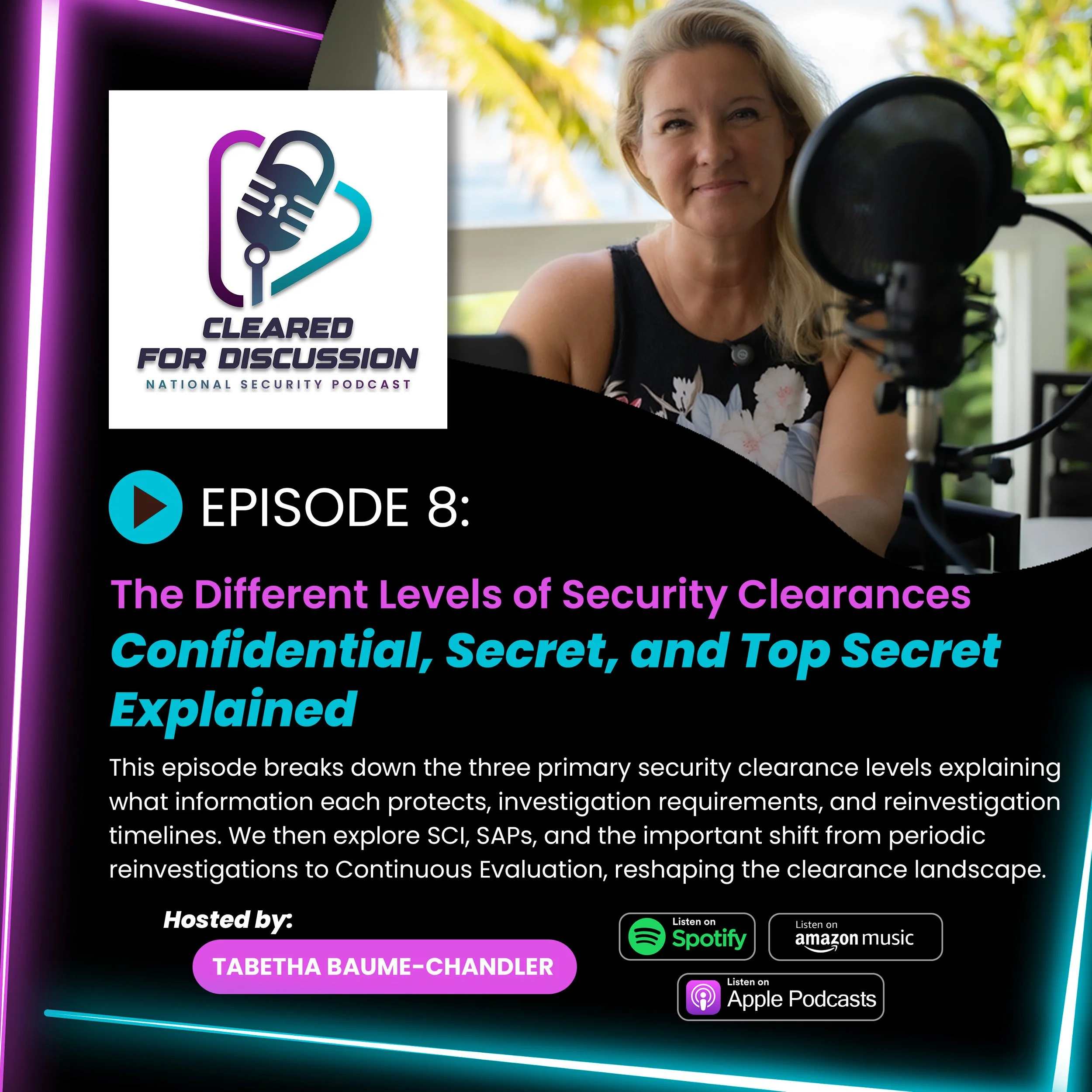 In this episode, Tabetha Baume Chandler explains the three main clearance levels — Confidential, Secret, and Top Secret — along with SCI and SAPs, highlighting what they protect and how they’re obtained. She details the investigation process, from background checks to polygraphs, and stresses that trustworthiness, finances, and conduct all factor into eligibility.